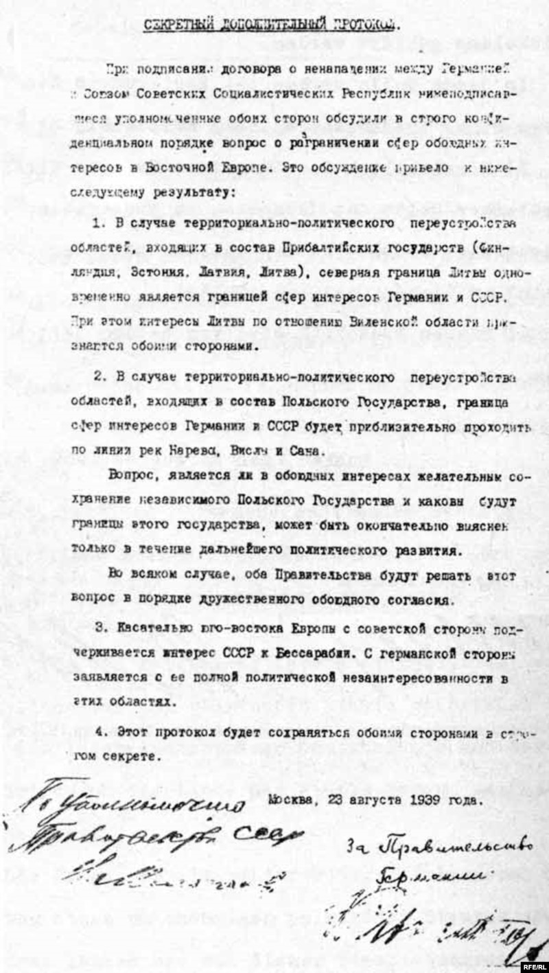 – Несколько лет назад Владимир Путин в интервью словацкому радио заявил, что пакт Молотова-Риббентропа был исторической необходимостью и представлял собой реакцию на подписание Мюнхенских соглашений, позволившим Германии аннексировать Чехословакию.