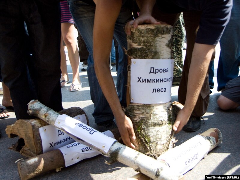 Защитники Химкинского леса и представители "Левого фронта" провели акцию у Белого дома. Евгения Чирикова и ее товарищи привезли с собой уничтоженные вырубщиками деревья - к бревнам прикреплены листки с надписями "дрова из Химкинского леса". Активисты собирали подписи под обращением к правительству России с требованием прекратить вырубку. Акция была пресечена милицией.