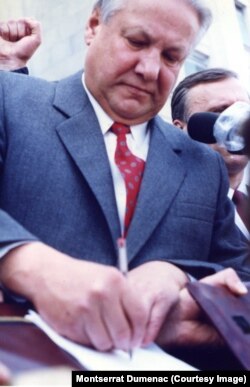 – Я была в МГУ на летнем курсе, как раз поехала к друзьям в Минск. Я встала утром, на кухне мама Светланы плачет. Я говорю: "Что происходит?" Показывают по телевизору "Лебединое озеро". Мне вкратце рассказывает, что, оказывается, переворот, неизвестно, где Горбачев, и так далее. Я говорю: "Тогда мне надо обратно в Москву". – "Нет, мы тебя не пустим". Я говорю: "А что, если надо будет, посольство только там испанское, здесь в Минске ничего нет". Так что я прилетела, помню, ночью, уже был комендантский час, а мои друзья-кубинцы, я с ними связалась, говорят: "Мы тебя встретим в аэропорту". Сели в машину, прямо в МГУ. Танки, колонны идут. Сейчас, наверное, по-другому, но я любопытный человек, еще молодая была очень, мне показалось, что это историческое событие, надо быть в первом ряду, даже записывать, фотографировать все. Я приехала в МГУ, познакомилась там две недели назад с испанцем Рамоном. Я говорю: "Рамон, давай поедем в центр". – "Ты с ума сошла? Многие уже уехали в свои страны". – "Я никуда не поеду, я остаюсь". – "У меня болит голова". – "Аспирин тебе дам, поехали". В центре целая история. В конце концов оказалась я на баррикадах у Белого дома, там я провела ночь среди защитников Белого дома. У меня альбом, столько фотографий. У одного пункта контроля я сказала, что я испанский журналист, что я потеряла свою команду, у меня аккредитация, но я не знаю, где они. Это неправда. "Испанка?" – "Да". – "Но пасаран. Хорошо, мы вас пустим". Я говорю: "Я просто хочу записывать, фотографировать". На следующий день объявили в 6 утра, что путч уже провалился. Узнали, что Ельцин будет выступать на балконе Белого дома. Мы стали узнавать, где, как пройти. Испанец Рамон, у него были связи в газете в Сарагосе, прислали нам удостоверение. Женщины, которые стояли в пресс-центре, говорят: "Девушка, я вас видела, пожалуйста, проходите". Поднялись на этот балкон, мы были первыми, которые там стояли. Можно сказать, не настоящие, конечно, журналисты, но у меня был диктофон, я с диктофоном, с моим фотоаппаратом "Ломо", у меня был такой маленький. Неужели мы первые оказались здесь на балконе, где сейчас будет выступать Ельцин? Стали приходить настоящие журналисты, Би-би-си, с такими камерами. Потом еще телохранители Ельцина. И тут Ельцин, а мы рядом. Охрана Ельцина лицом ко мне. Ельцин обещал, что страна выйдет из всего этого. Хотел расписаться, не было ручки, я дала свою ручку. Есть фотография даже, что он расписывается этой ручкой.