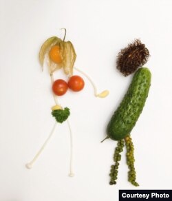 – Мальчик у вас, естественно, представлен огурцом. А девочка – две помидорки черри, физалис (желтая ягода) – это ее голова, и листики как прическа. Откуда эта идея – овощи как живые персонажи?