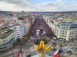 На Вацлавской площади в Праге собрались тысячи людей, чтобы высказать свое несогласие с войной России в Украине.